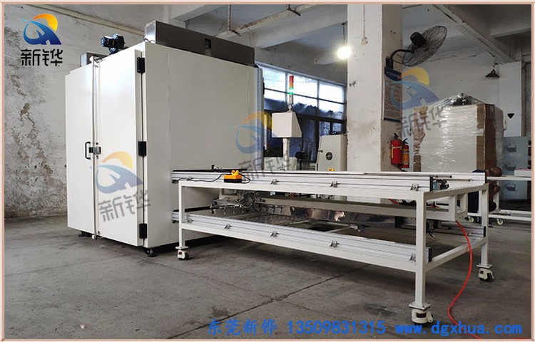機臺結構:進出料機構1套:長2350*寬1250*高850MM(上料位料盤離墻面約1500MM) ;烘烤尺寸:長1600*寬1630*高1570mm(2組加熱控制); 推料機構:2套;頂部安裝吊環.